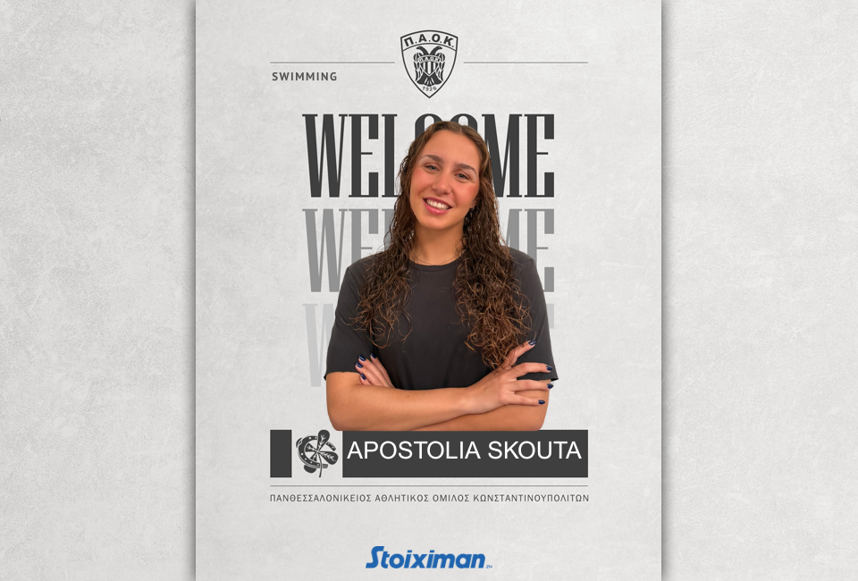 Ο ΠΑΟΚ και το τμήμα Κολύμβησης, ανακοινώνουν την έναρξη συνεργασίας με την αθλήτρια, Αποστολία Σκούτα. Η Αποστολία Σκούτα, γεννημένη το 2007, είναι αθλήτρια του αγωνίσματος της πεταλούδας, και έρχεται στον