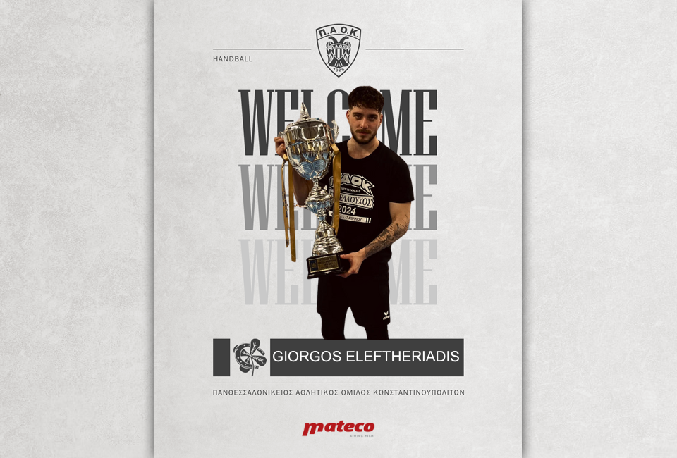 Ο ΠΑΟΚ και το τμήμα Χάντμπολ Ανδρών, ανακοινώνουν την έναρξη συνεργασίας με τον αθλητή, Γιώργο Ελευθεριάδη, για την αγωνιστική σεζόν 2025-2026. Γεννημένος στις 22/08/2001, ο Γιώργος Ελευθεριάδης αγωνίζεται ως πλέι